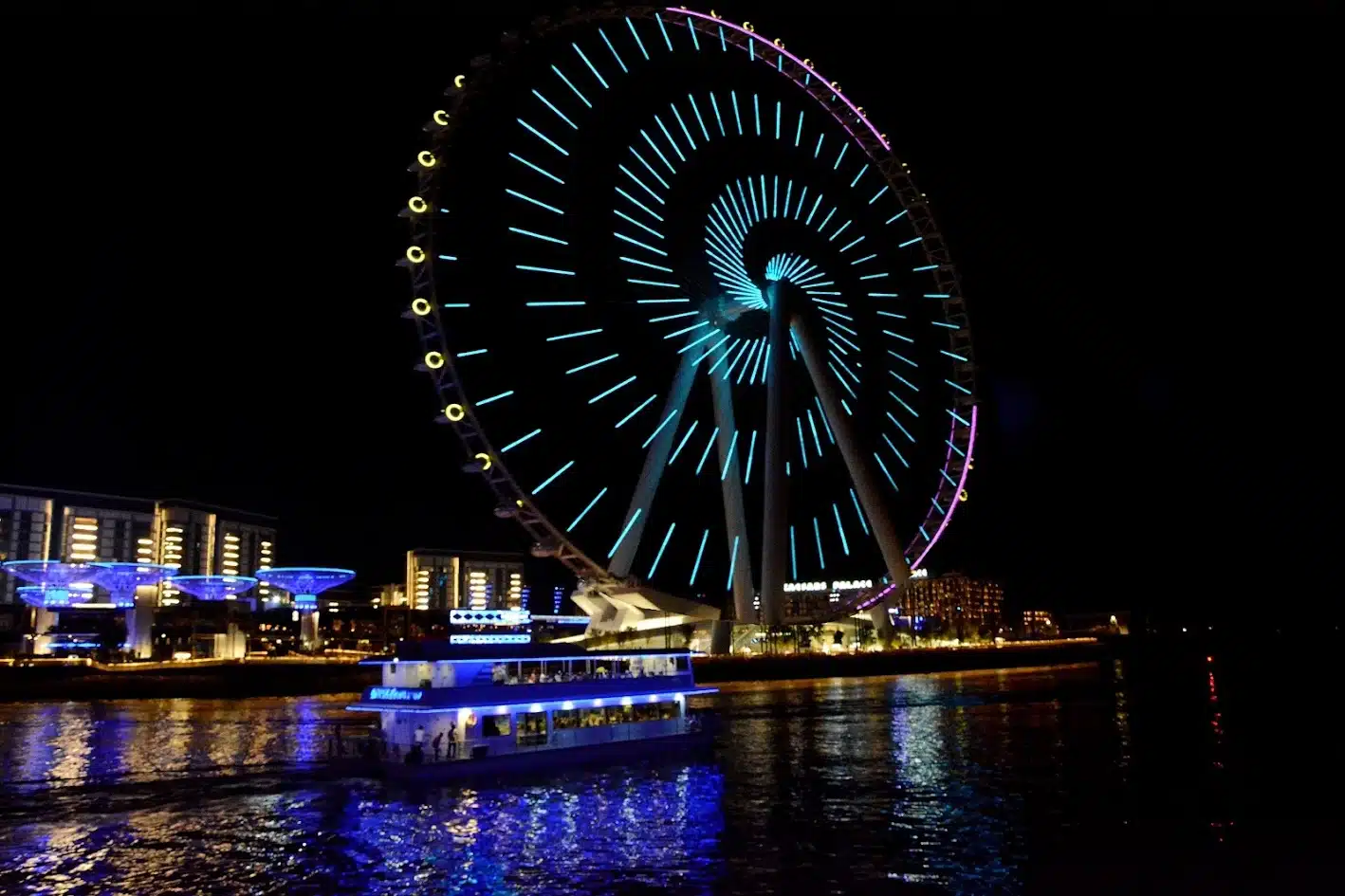 The world’s tallest observation wheel dominates the skyline with its stunning light displays. This engineering marvel is impossible to miss and makes for incredible photos from the water.
